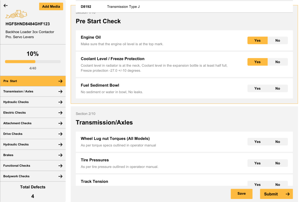 The Left Panel shows the machine details and a Completed Percentage for the current inspection. Below is a quick link to specific subsections of the inspection. A total number of defects is shown at the bottom of this panel.
